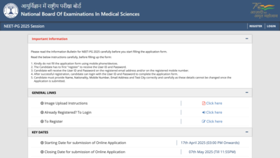 The National Board of Examinations in Medical Sciences (NBEMS) is going to conclude the application process for the National Eligibility cum Entrance Test Postgraduate (NEET PG) today. Candidates who have not registered for the test can apply online till 11.55 PM. The link to fill the NEET PG application form is available at natboard.edu.in. As per the schedule released by NBEMS, registered candidates will be able to make corrections in their application forms May 17 onwards.Candidates will only be allowed to rectify deficient or incorrect images of their photograph, signature, and thumb impression. The upcoming NEET PG exam is scheduled to be conducted on June 15, 2025. Individuals who register for the examination online will be able to download their hall tickets June 11 onwards.